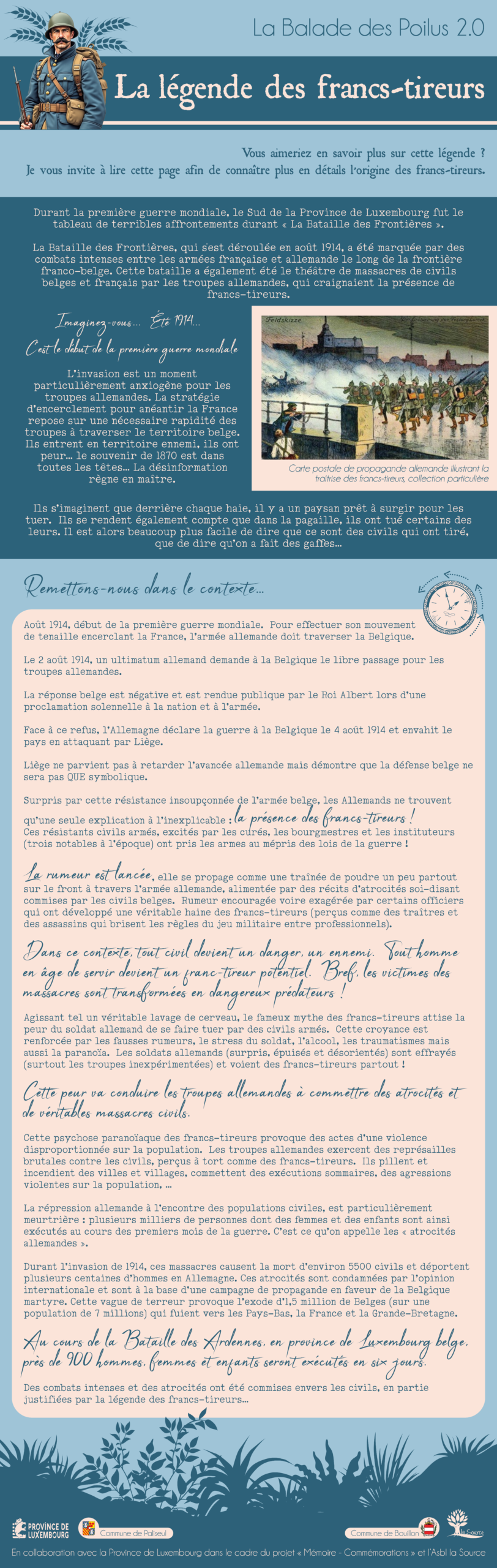 Le « mythe des francs-tireurs » a été distillé lors de l’invasion allemande en Belgique en août 1914 dans un contexte de résistance inattendu. Lorsqu’ils entrent en territoire ennemi, au début de la guerre 14-18, les soldats allemands ont peur. Le souvenir de 1870 est dans toutes les têtes… Ils s’imaginent que derrière chaque haie, il y a un paysan prêt à surgir pour les tuer. C’est LA NAISSANCE DE LA LÉGENDE DES FRANCS-TIREURS durant la guerre 1914-1918. Les Allemands sont surpris par la résistance insoupçonnée de l’armée belge. Dans ce contexte, tout civil devient un danger, un ennemi. Cette peur va conduire les troupes allemandes à commettre des atrocités et de véritables massacres civils. Durant l’invasion de 1914, ces massacres ont causé la mort d’environ 5500 civils et la déportation de plusieurs centaines d’hommes en Allemagne.